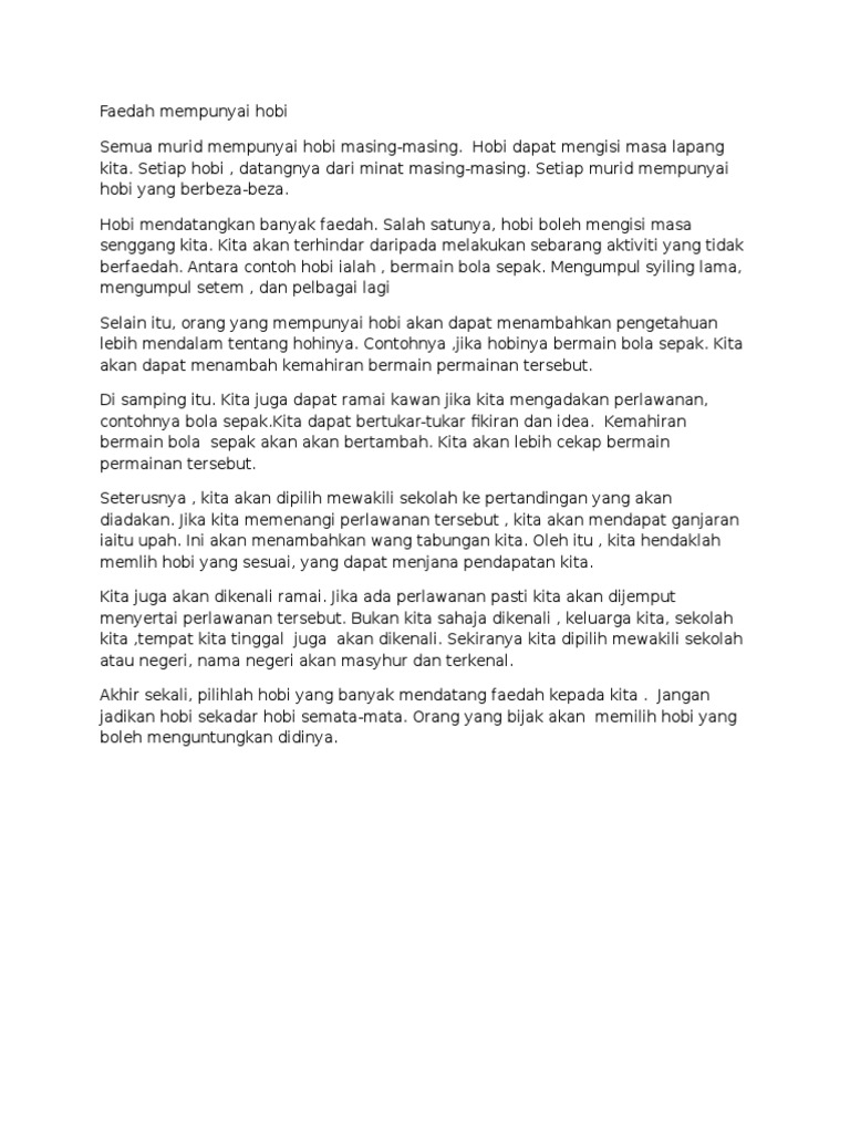 Karangan Hobi Saya Pdf Ibu bapa yang terlalu memberi kebebasan. KEPENTINGAN HOBI TERHADAP INDIVIDU. Hobi ini saya lakukan pada waktu petang selepas belajar dan menyiapkan kerja sekolah yang diberi oleh guru.
